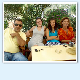 We are Nikos and Jenny, a Greek family who, with our two daughters, live in the village of Harakopio where we run Nikos Taverna as part of the family business. The taverna is open each evening serving grills, salads and home cooked food in season. Each Sunday morning (from 10am) we sell the local speciality of spit-roast pork.